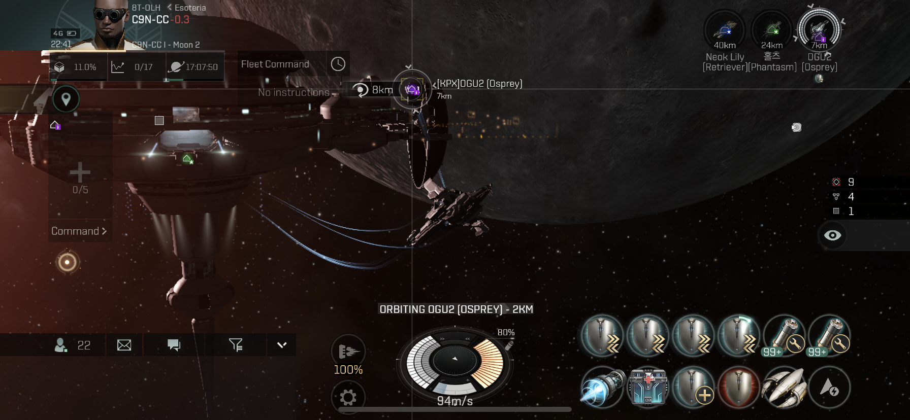 스킬은 Remote Shield Operation (5/5)와 Cruiser Engineering(5/5/4)까지 세팅하였습니다.