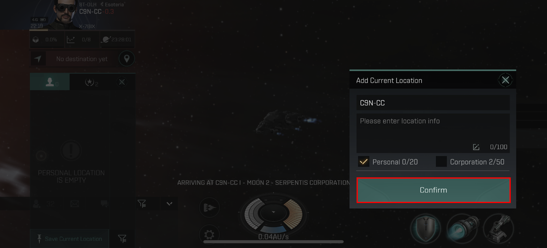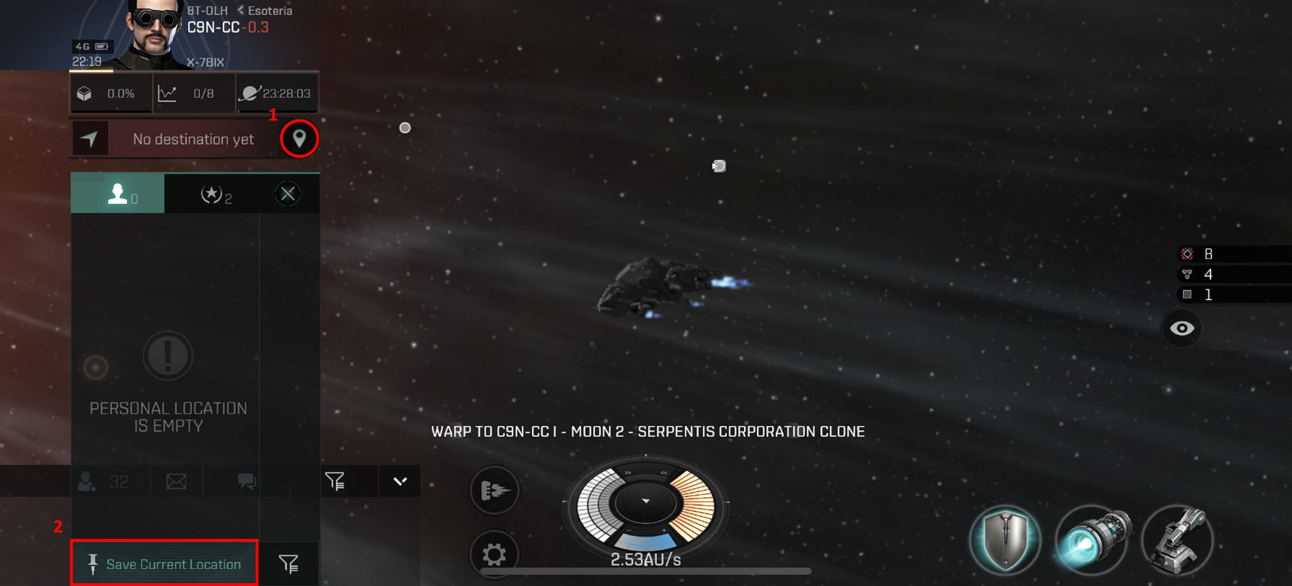2) 저장한 C지점으로 워프 후 D지점으로 워프 하면서 E지점에서 Save Surrent Location 버튼을 클릭하여 북마크를 저장합니다.