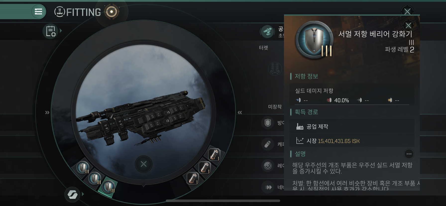 나머지 Combat Rig에는 Anti-EM / Anti-Thermal Screen Reinforcer III 장착해줍니다.