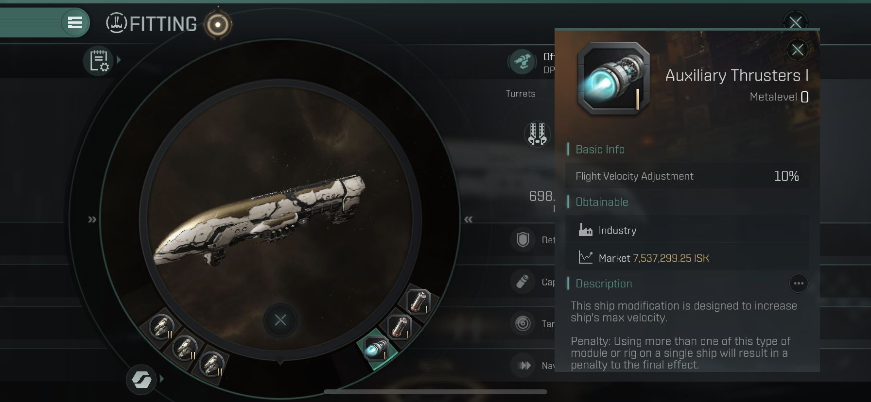 첫번째 Rig에는 느린 배쉽의 속도 증가를 위해 Auxiliary Thrusters I 한개를 장착해 주었습니다.