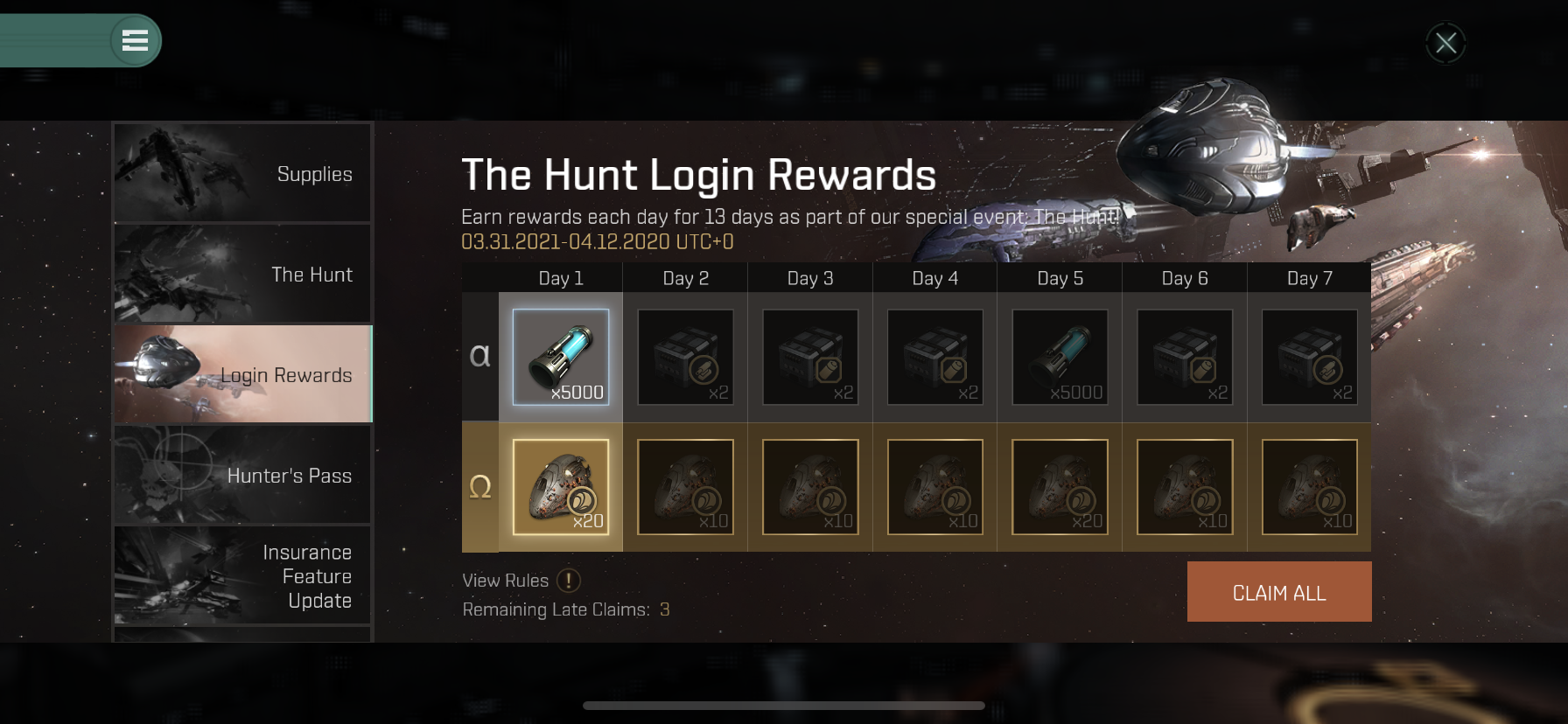 | 1일 차 | 스킬 포인트 : 5,000 | 망가진 우주선 캡슐 : 20 (Damaged Capsule) |