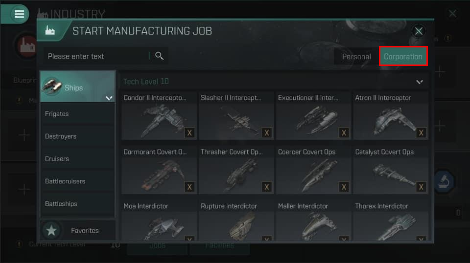 Copration 버튼을 클릭하고 함선을 선택하면, START MANUFACTURING JOB 화면과 동일하게 Personal과 Corporation 버튼이 추가된 걸 확인하실 수 있습니다.