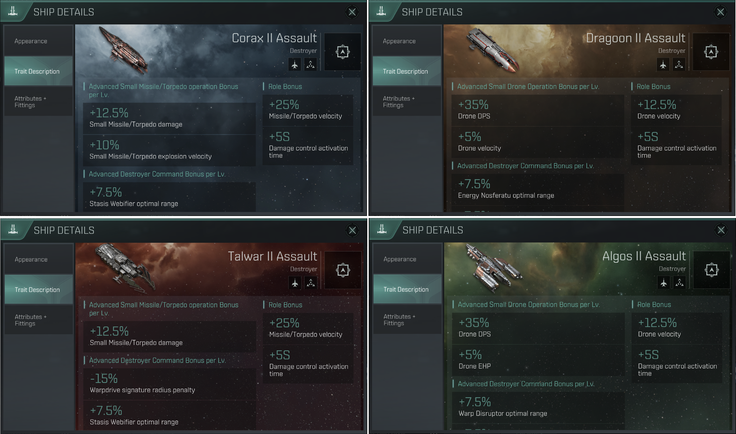 Dragoon Assault, Corax Assault, Algos Assault, Talwar Assault는