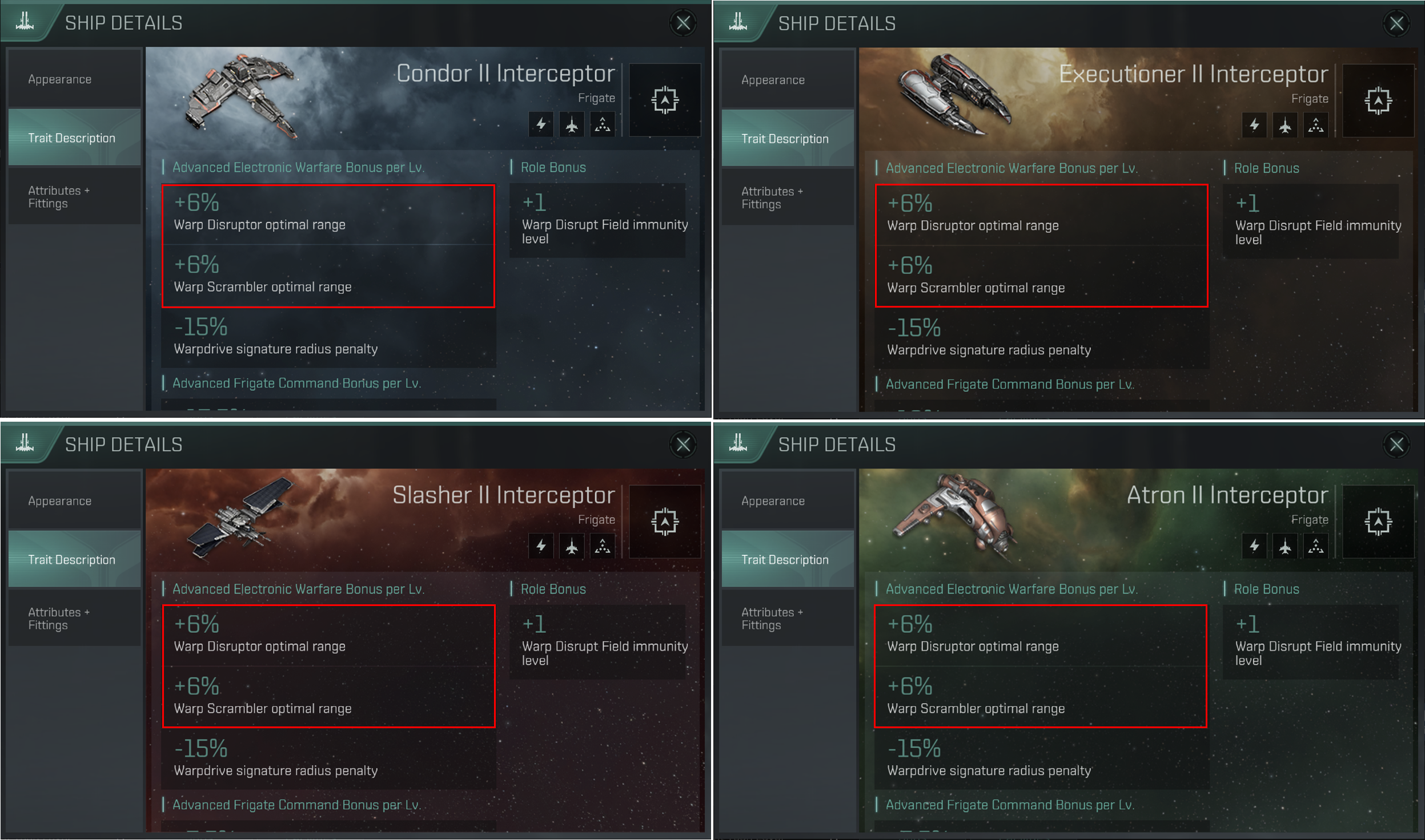 Executioner II Interceptor, Atron II Interceptor, Slasher II Interceptor, Condor II Interceptor는