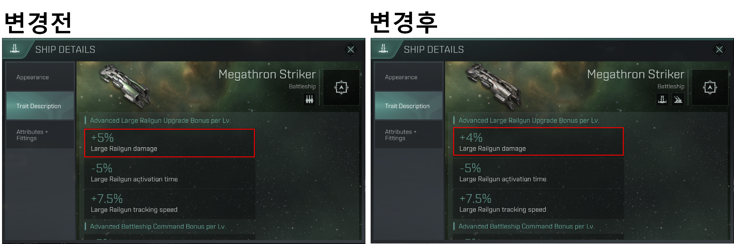 Megathron Striker는 Advanced Large Railgun Upgrade 레벨당 Large Railgun Damage가 5%에서 4%로 감소했습니다.