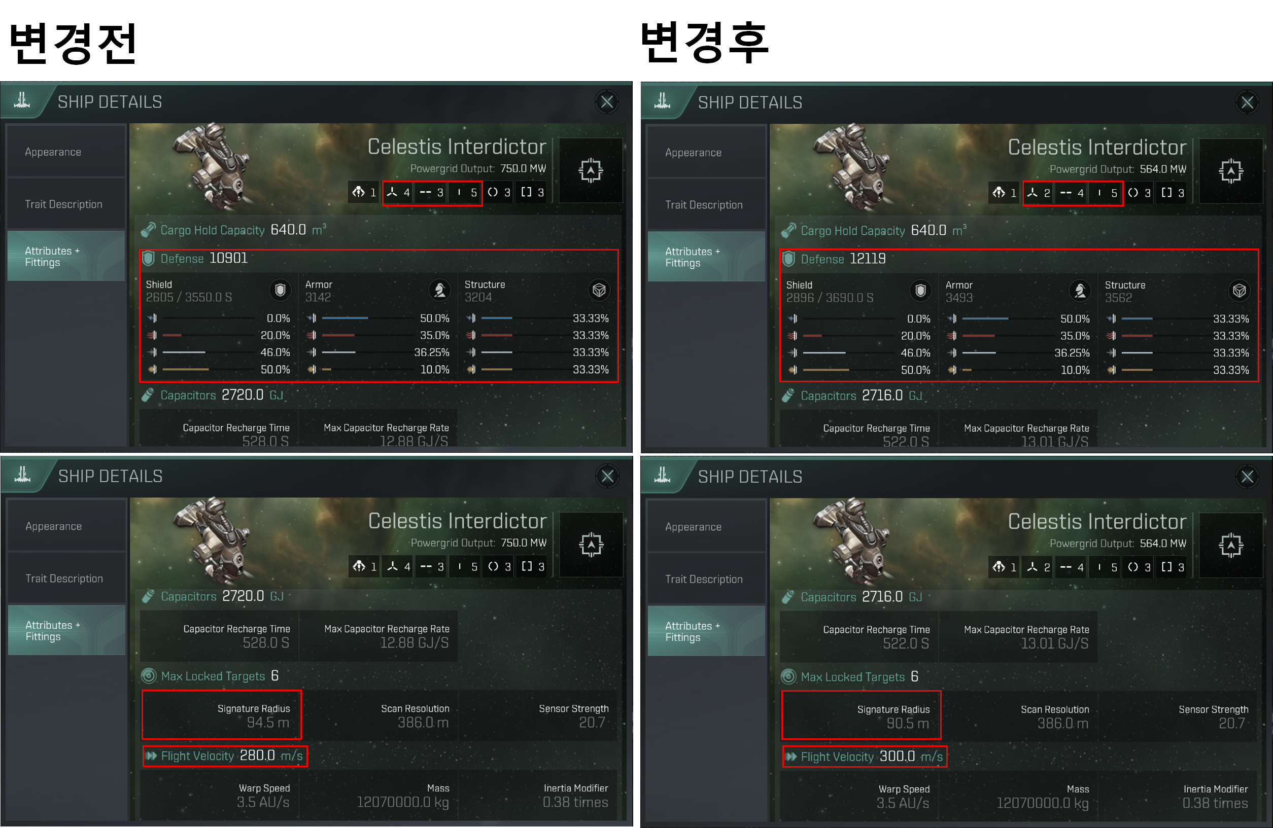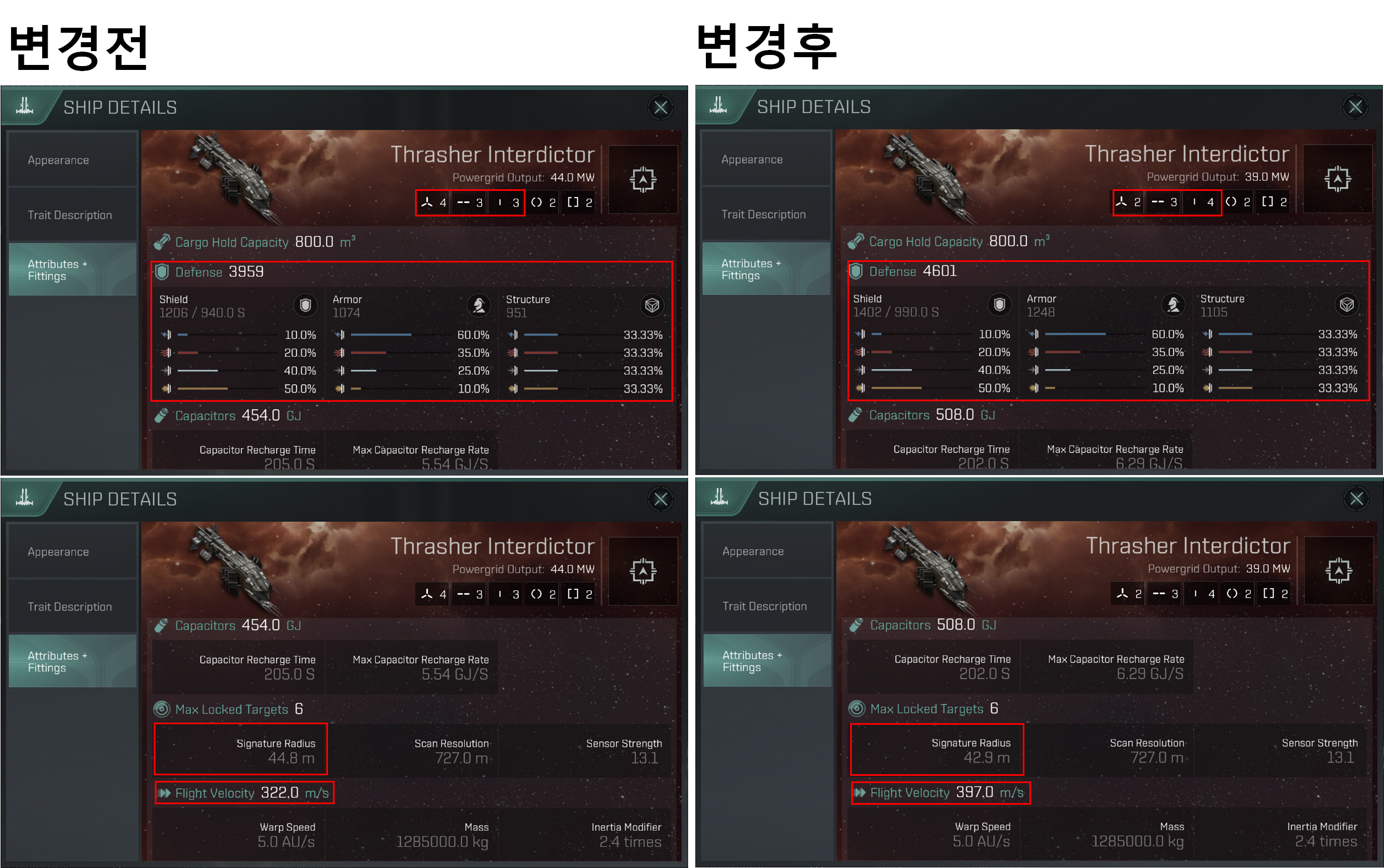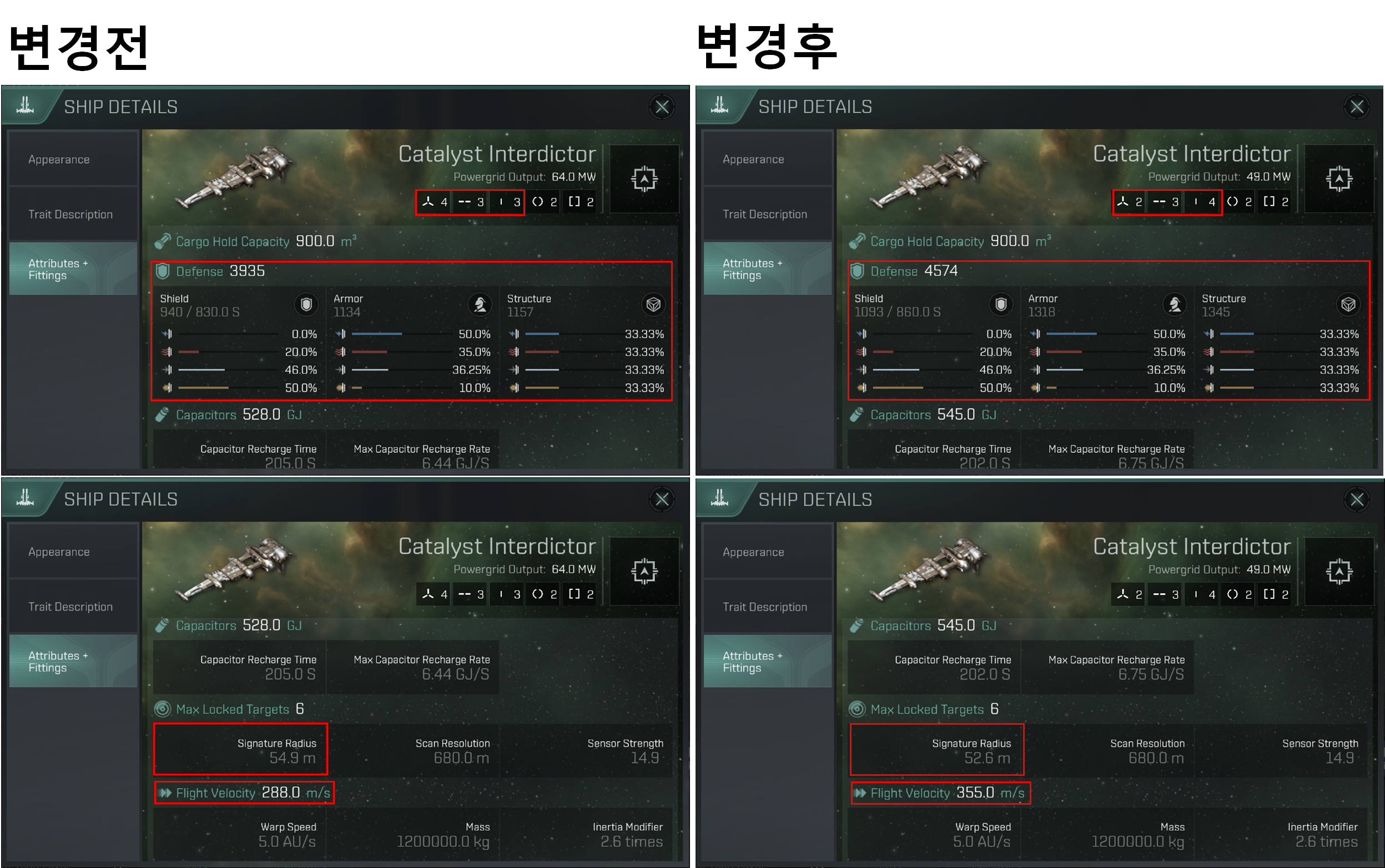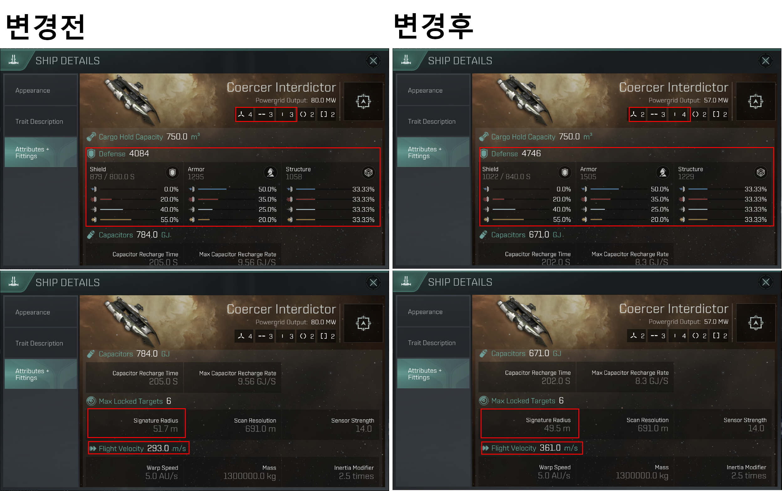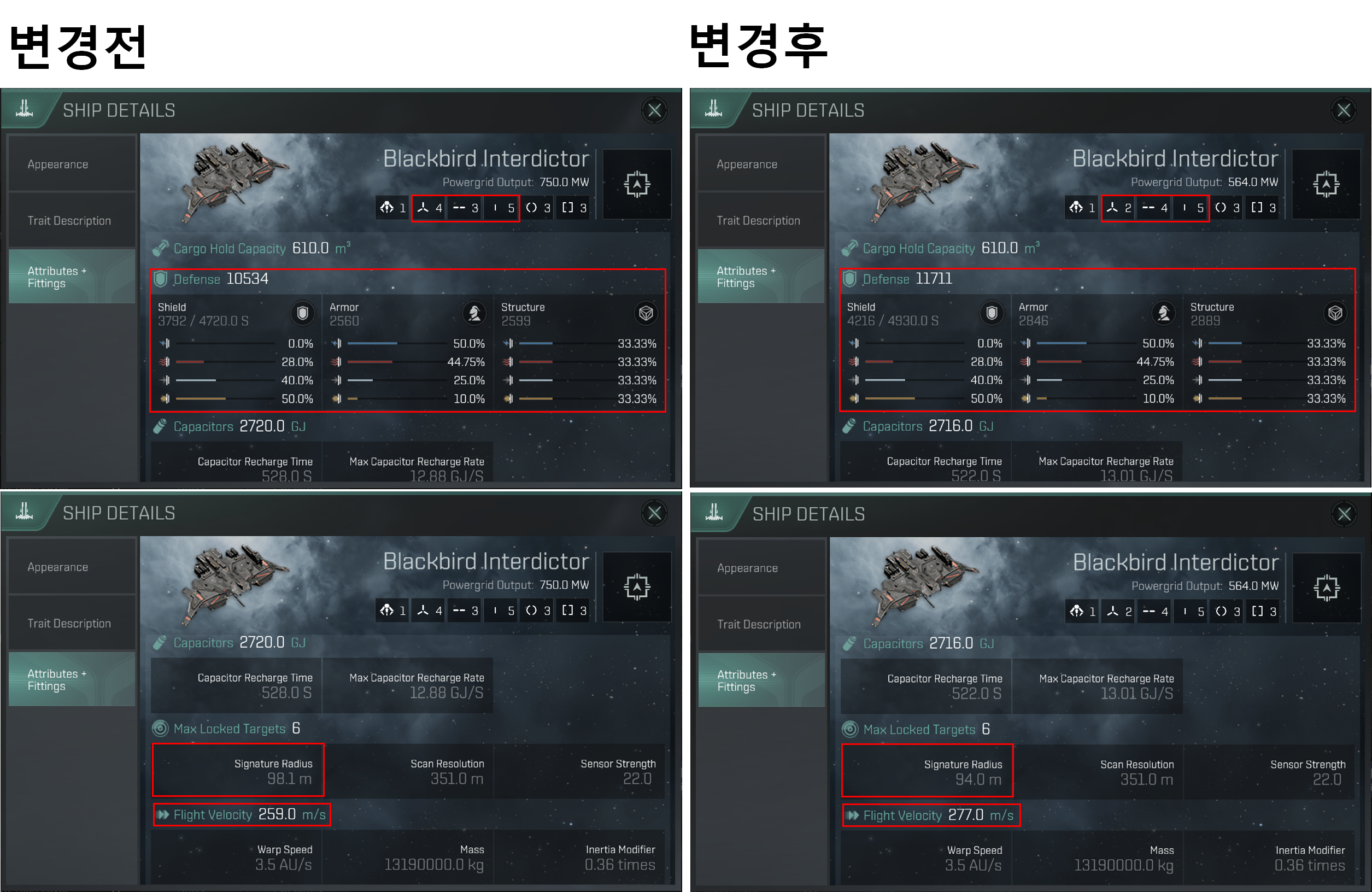 High Slot이 2 ~ 3개 감소(특정 함선에 따라 다름), Mid Slot이 3개에서 4개로 증가했습니다.