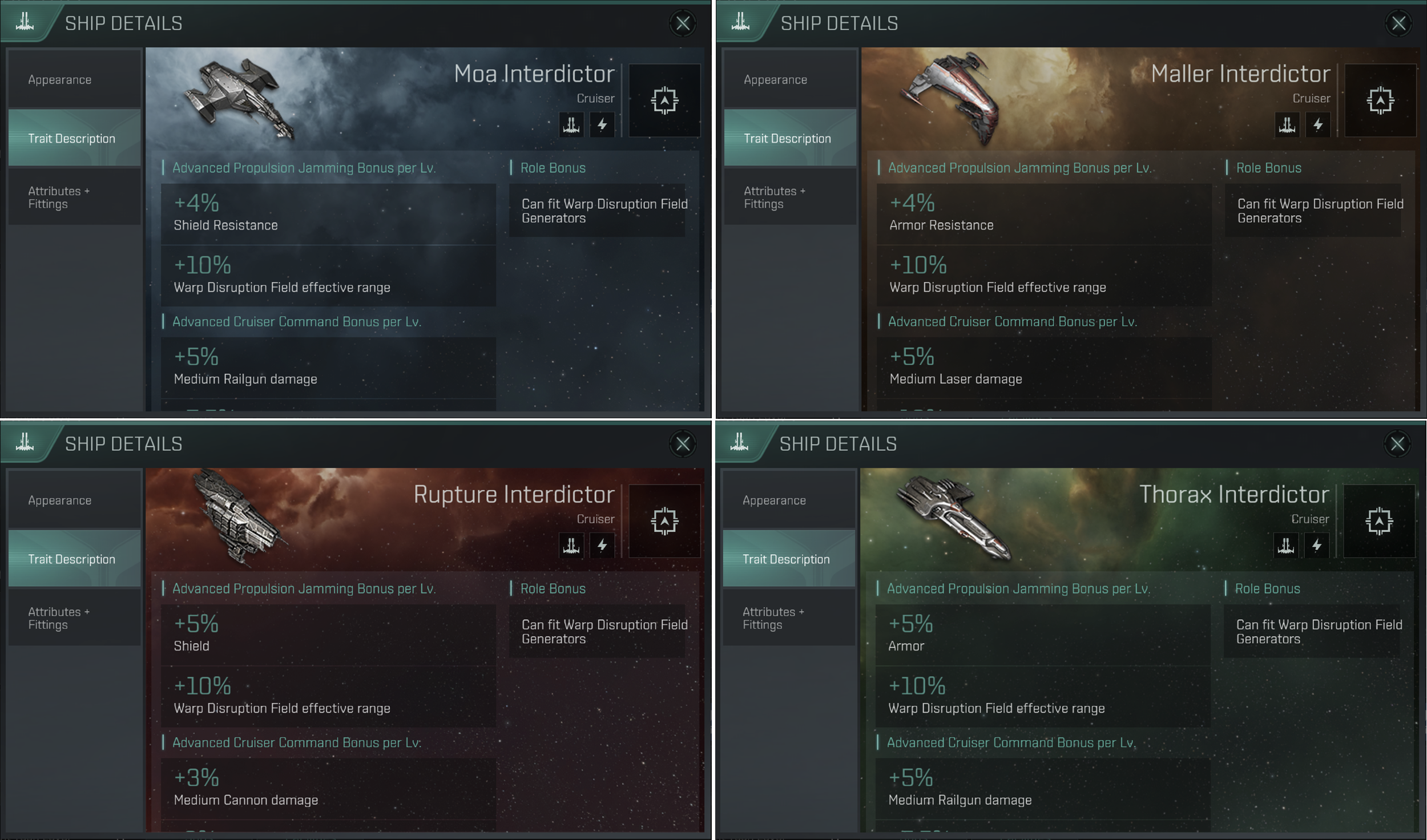 Maller Interdictor, Moa Interdictor, Rupture Interdictor 및 Thorax Interdictor는
