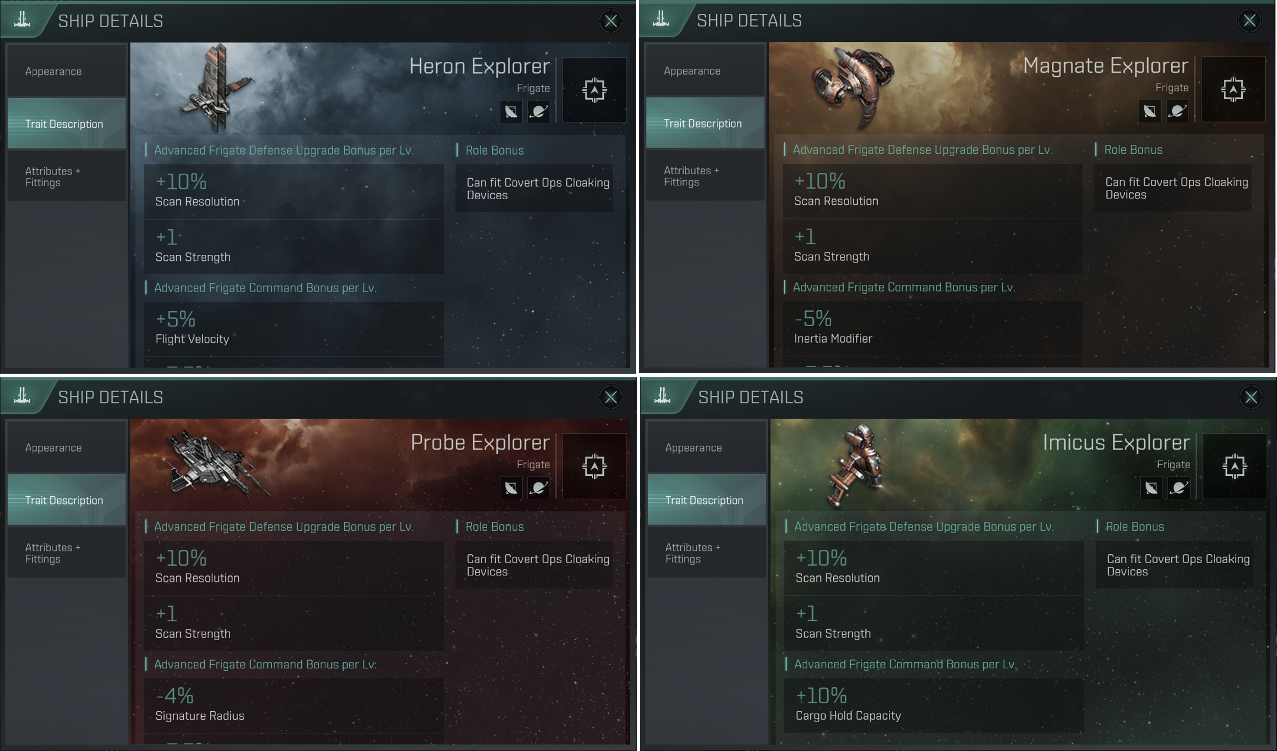 탐사 전용 함선으로 보이는 Heron Explorer, probe Explorer, Magnate Explorer, Imicus Explorer 함선이 추가 되었습니다.