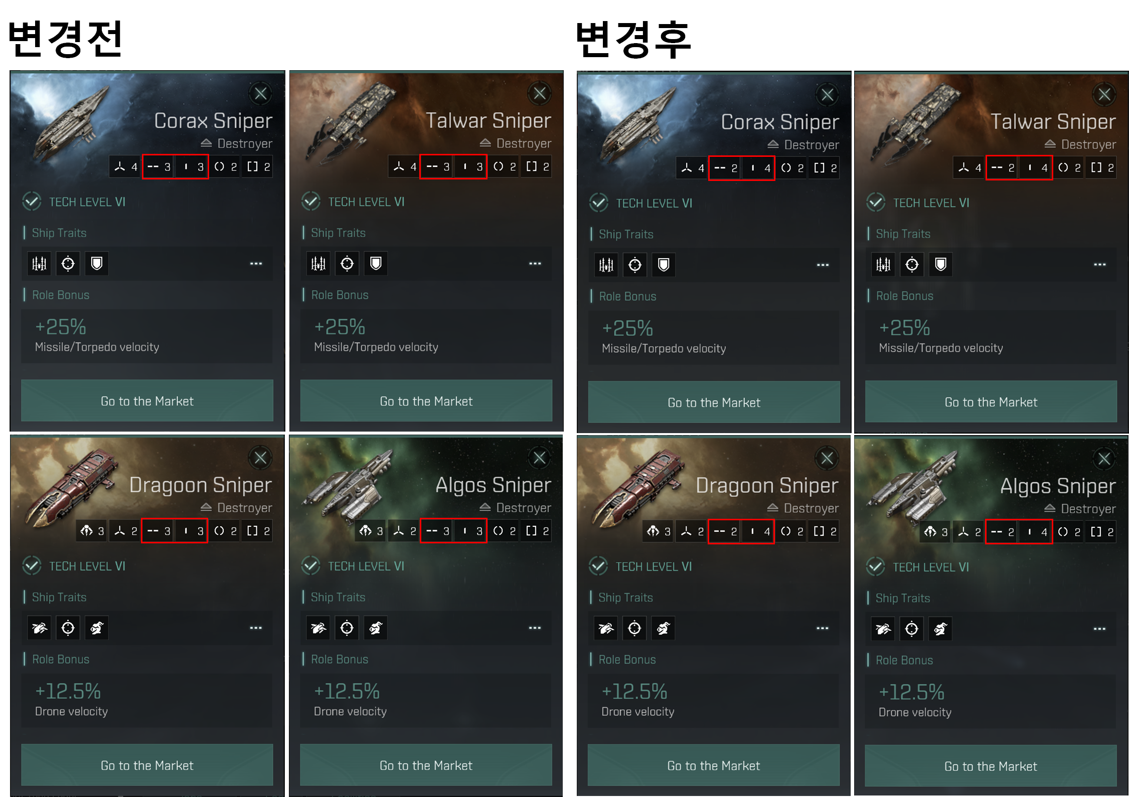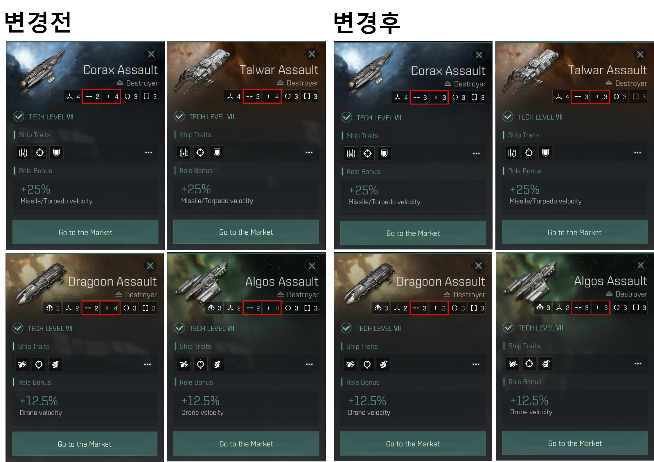 신규 Destoryer 함선들이 추가 되면서 Cormorant Covert Ops, Thrasher Covert Ops, Coercer Covert Ops, Catalyst Covert Ops 함선은 삭제 되었습니다.