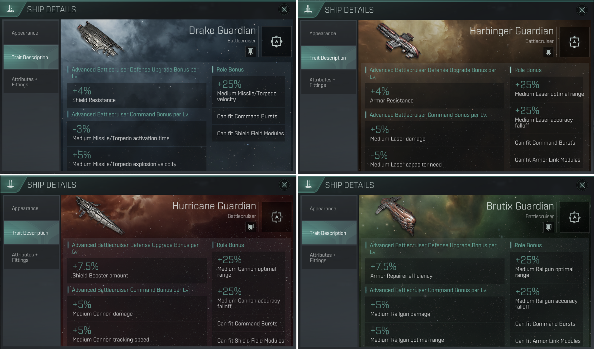 Drake Guardian, Hurricane Guardian, Harbinger Guardian, Brutix Guardian 함선이 추가 되었습니다.