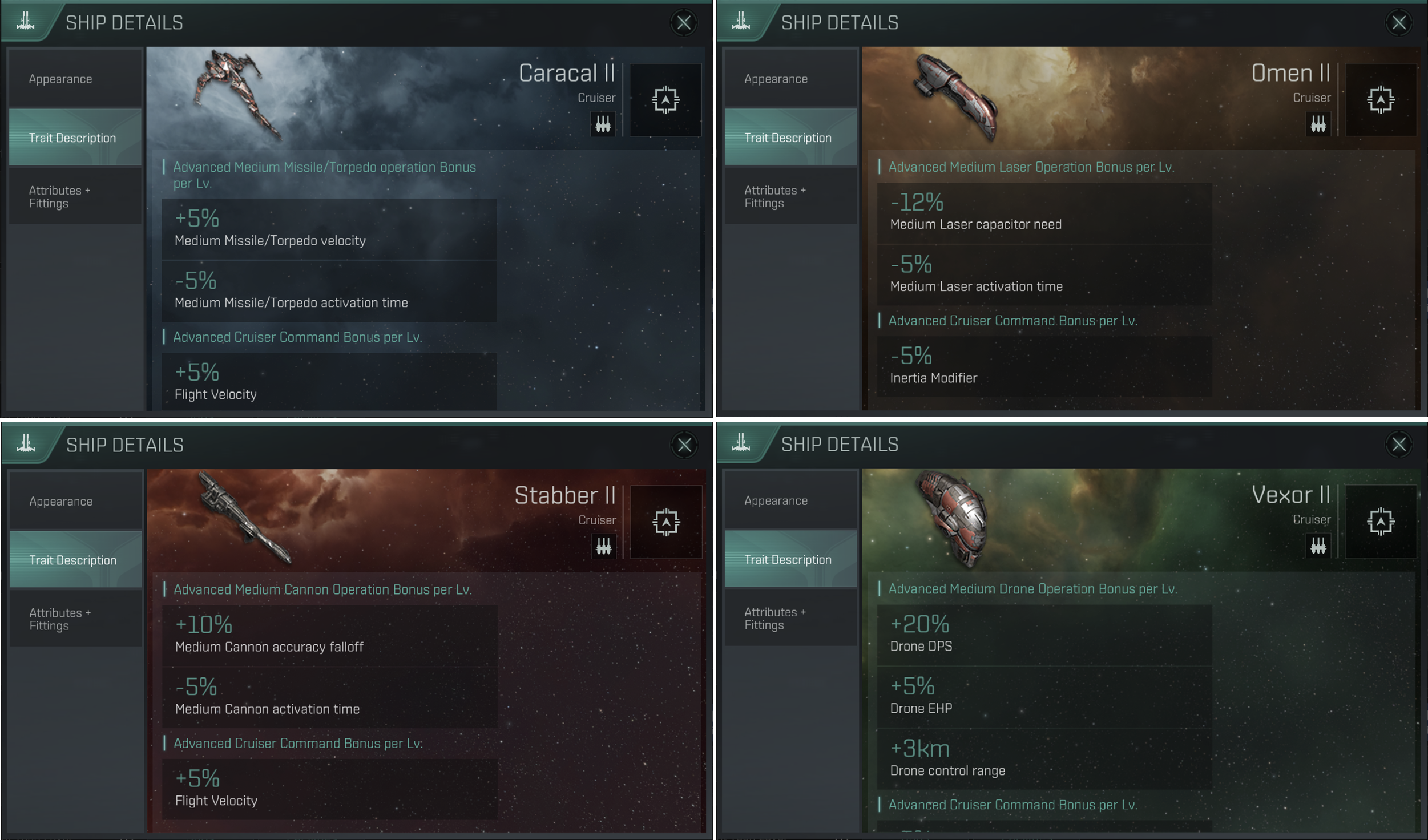Caracal II, Stabber II, Omen II, Vexor II 함선이 추가 되었습니다.