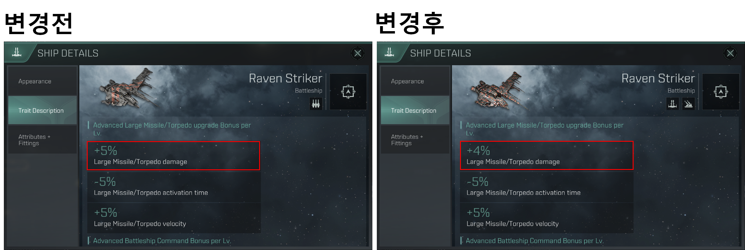 Rave Striker는 Advanced Large Missile/Torpedo Operation 레벨당 Advanced Large Missile/Torpedo Damage가 5 %에서 4 %로 감소했습니다.