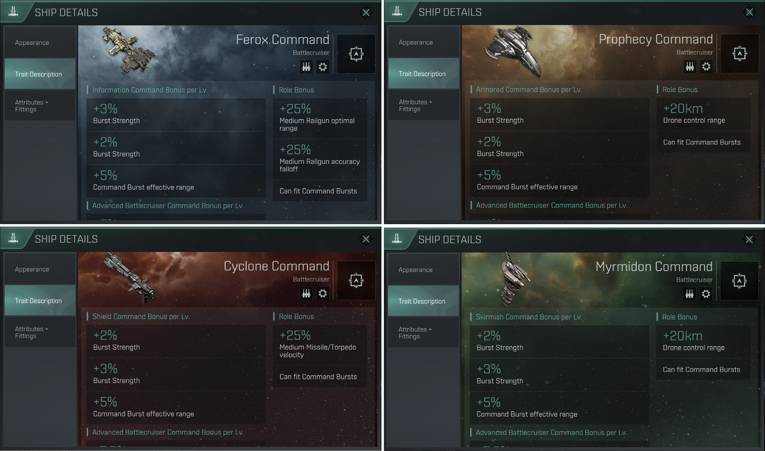 Command Bursts를 사용할 수 있는 Ferox Command, Cyclone Command, Prophecy Command, Mymidon Command 함선이 추가 되었습니다.