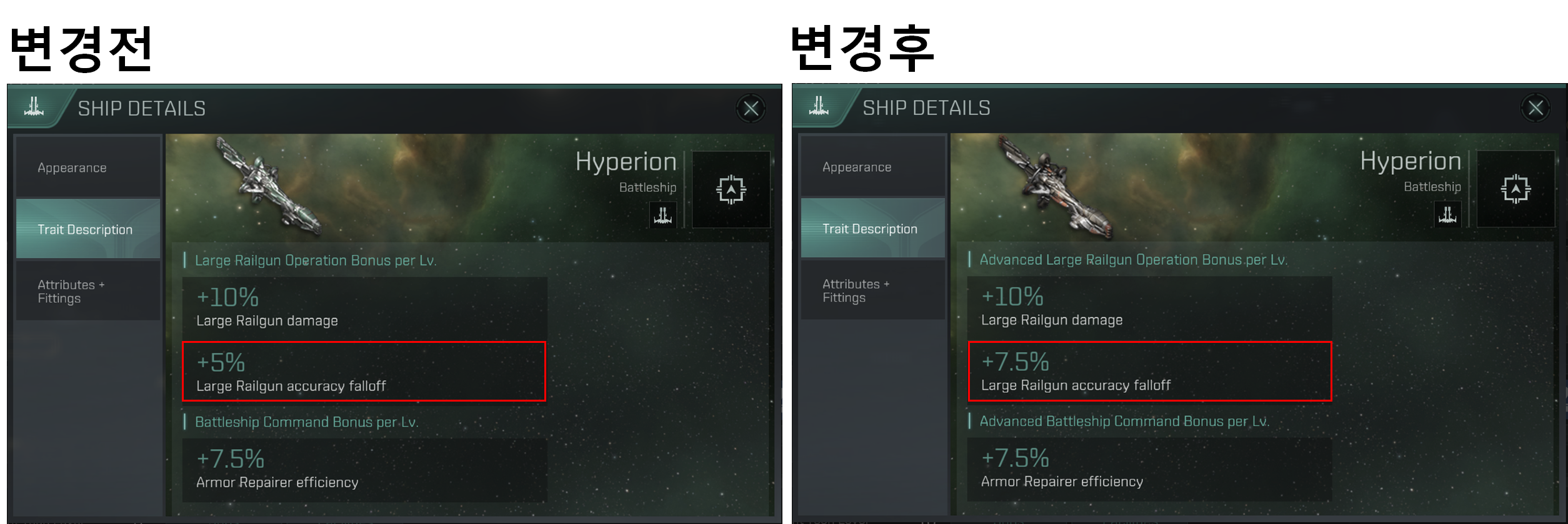 Advanced Large Railgun Operation 레벨당 Large Railgun Accuracy Falloff가 5 %에서 7.5 %로 증가했습니다.