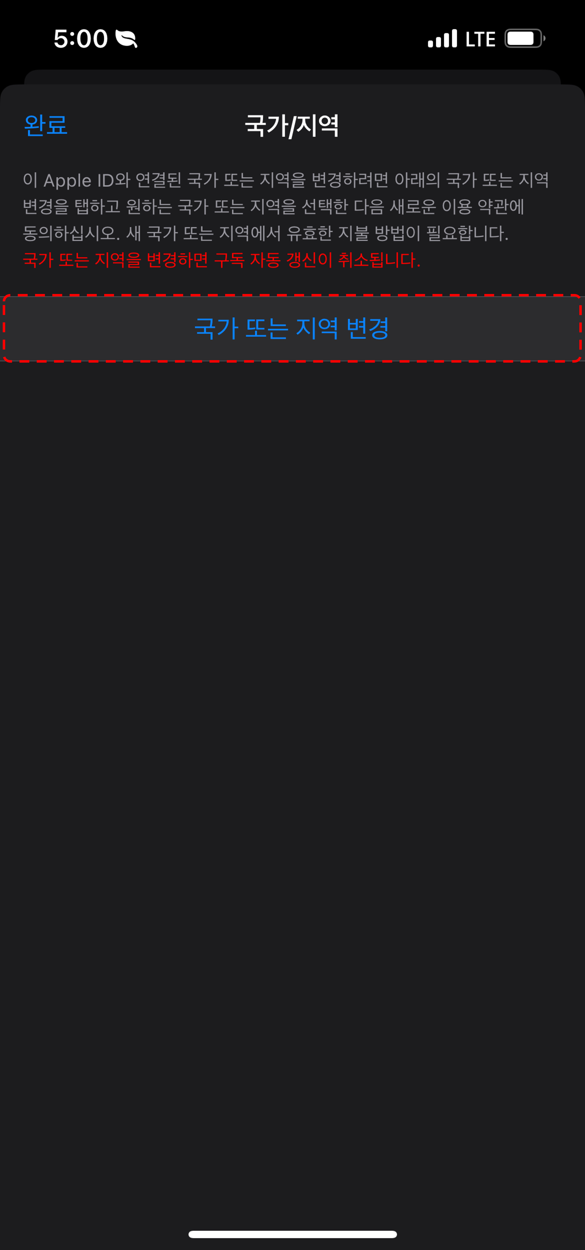 국가/지역 화면에서 국가 또는 지역 변경 버튼을 눌러줍니다.