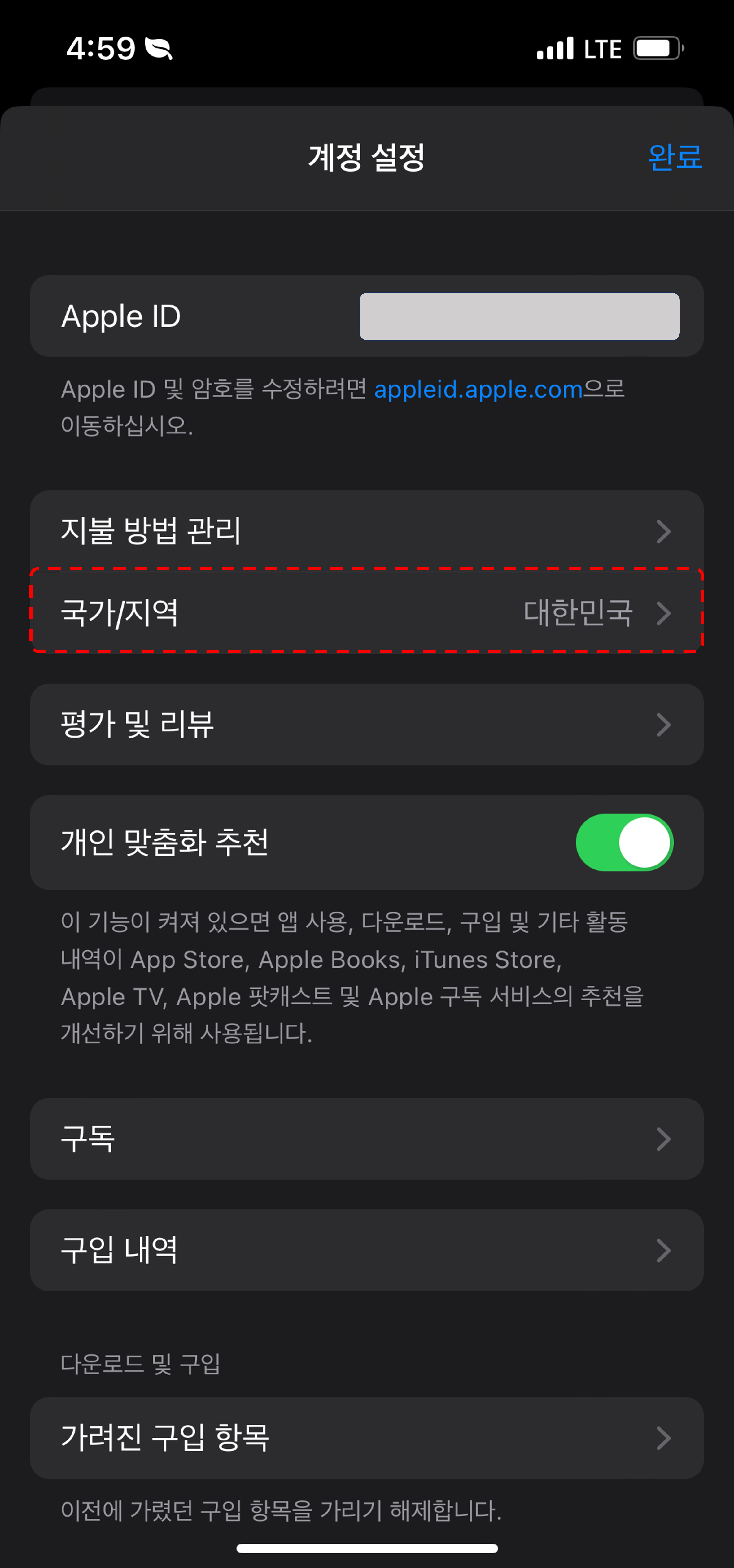 계정 설정 화면에서 국가/지역을 눌러줍니다.
