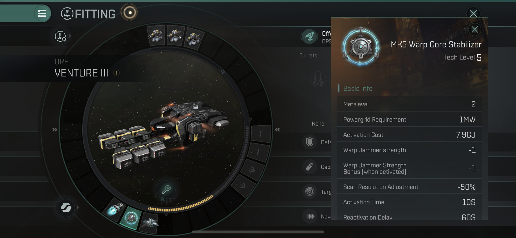 VENTURE II High Slots - MK5 Miner - MK5 Miner Mid Slots - X Low Slots - MK1 Small Afterburner - MK3 Warp Core Stabilizer Combat Ring - X Engineering Rig - Miner Circulation Accelerator - Miner Circu..
