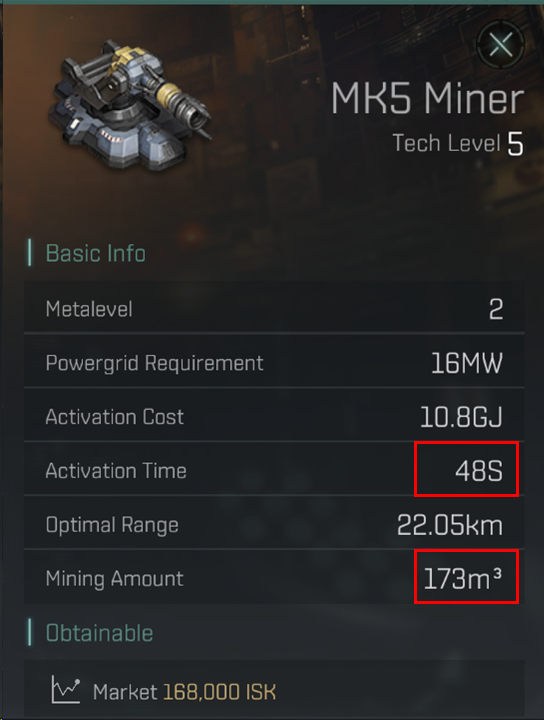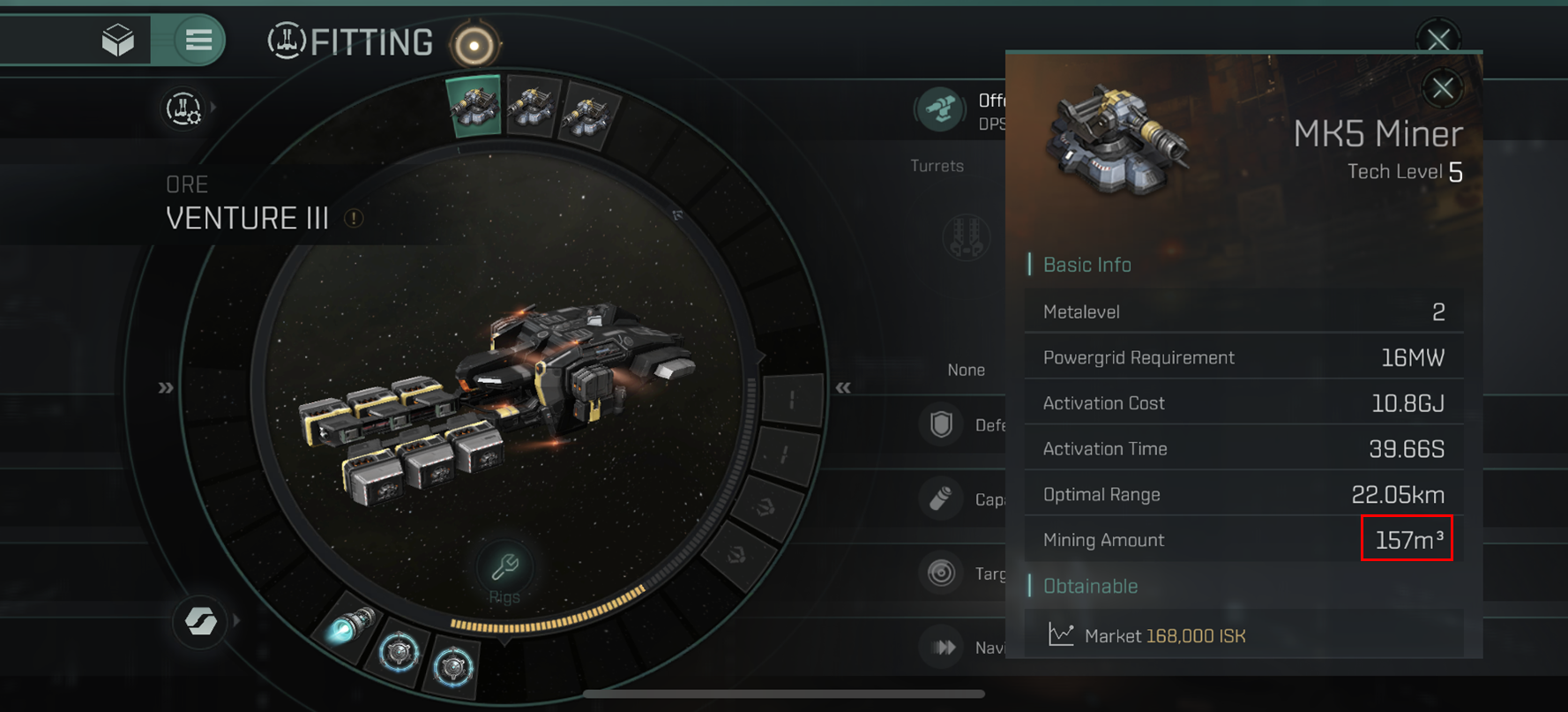 Venture III에 MK5 Miner를 장착 후 계산을 해보도록 합시다.