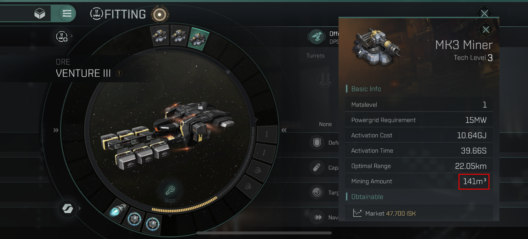 이번엔 Venture III에 MK3 Miner를 장착 후 계산을 해보도록 합시다.