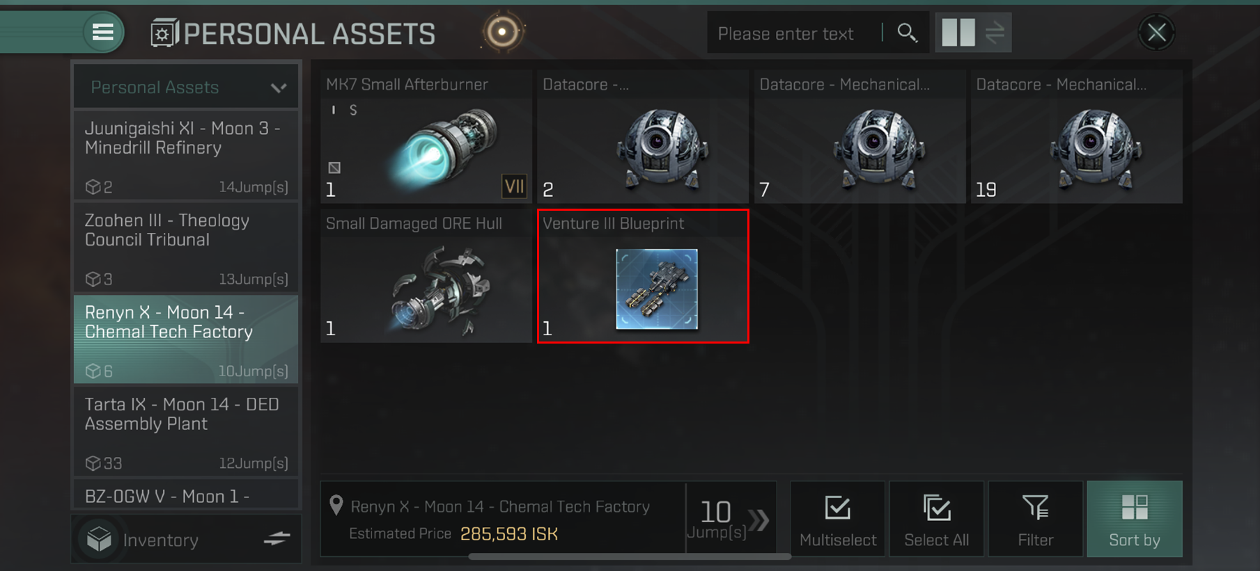 Ships Blueprints > Industrisl Ships > Tech Level 6 > Ventrue III Blueprint를 선택합니다.