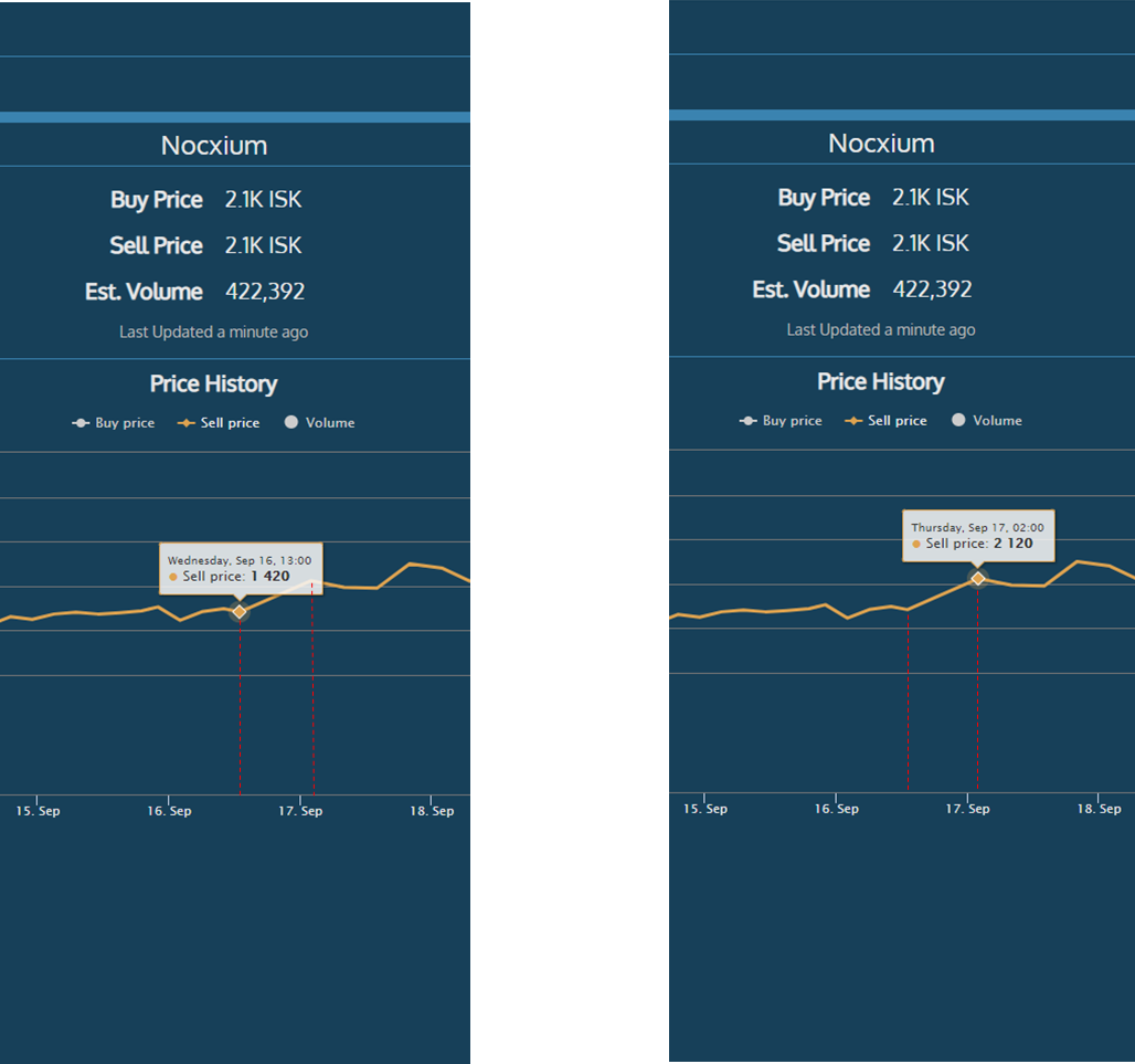 Nocxium의 가격이 1,420 ISK --> 2,120 ISK 갑작스럽게 올라간 걸 볼 수 있습니다.