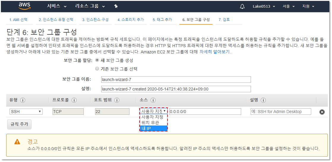 6. 보안 그룹 구성에서는 방화벽 설정하는 화면입니다.