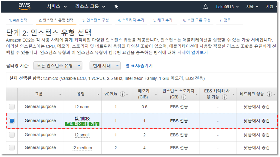 우리는 프리 티어인 t2.micro를 선택합니다.