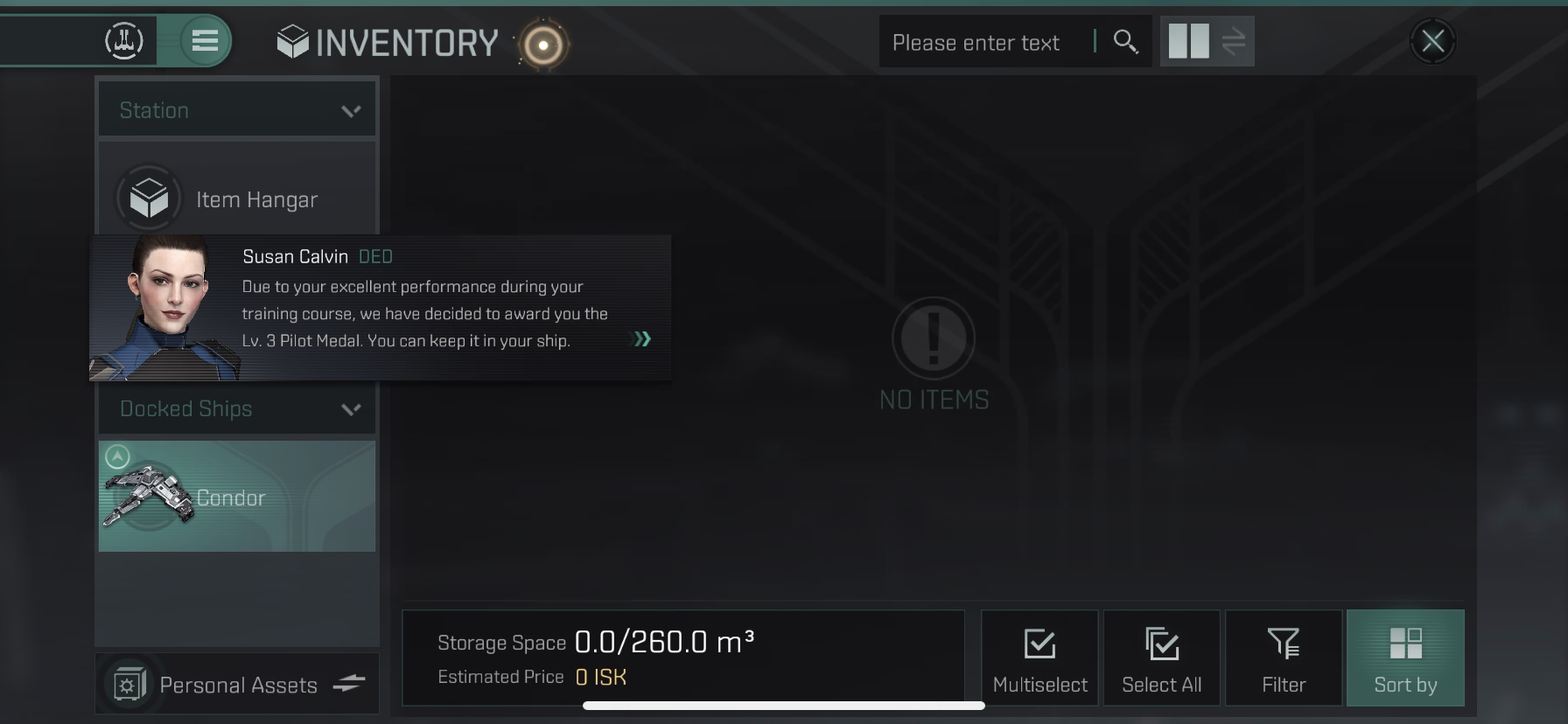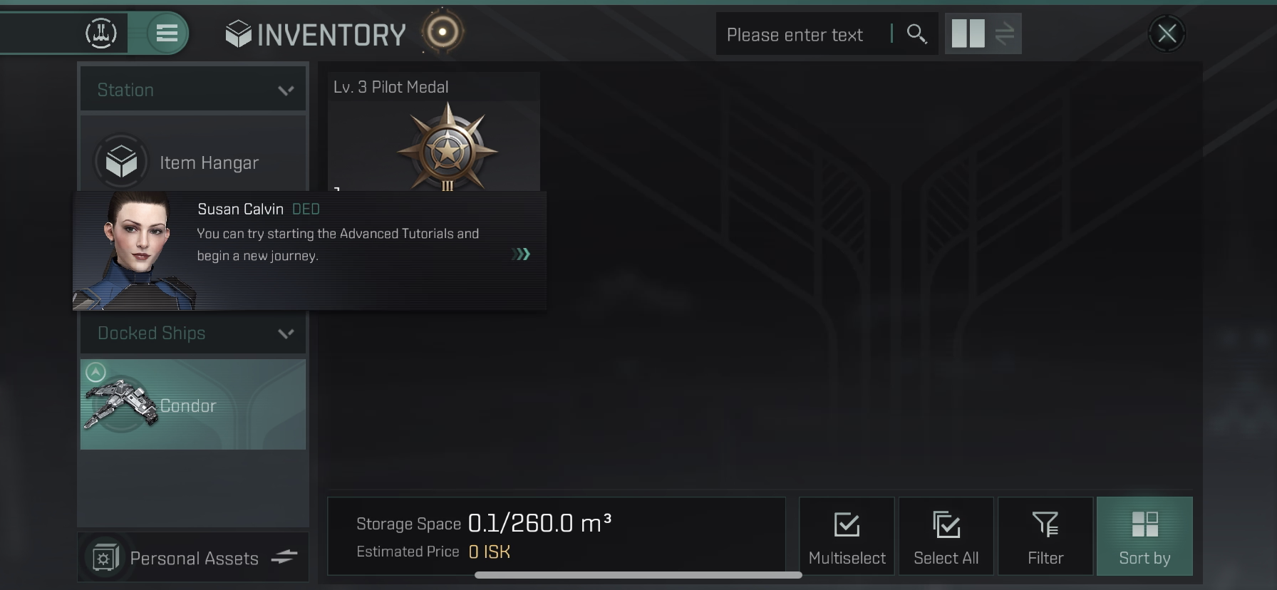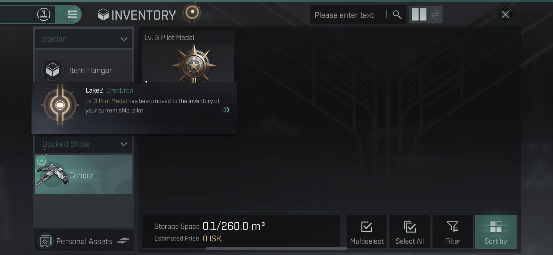Item Hanger > Lv.3 Pilot Medal 선택 > Move to 선택 > Atron Cargo Hold로 이동