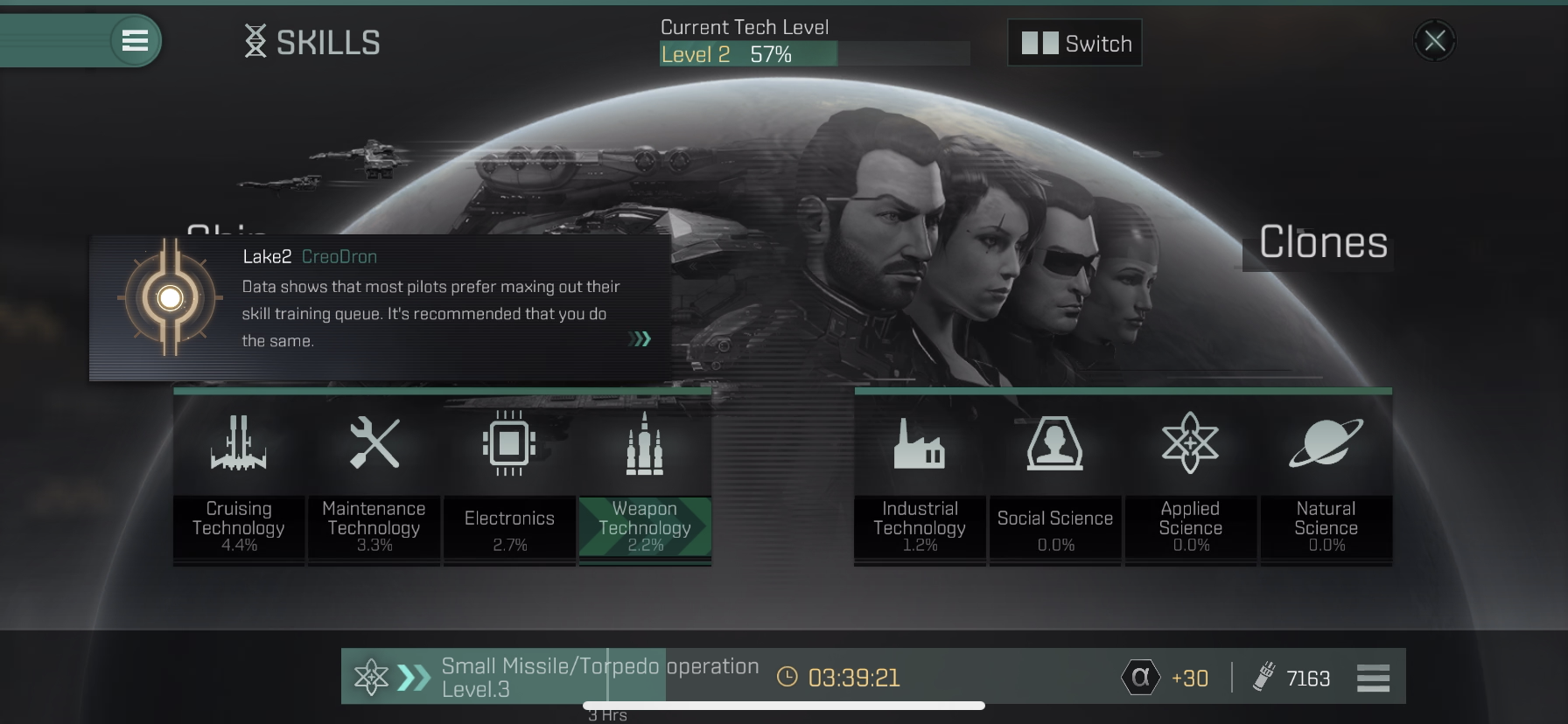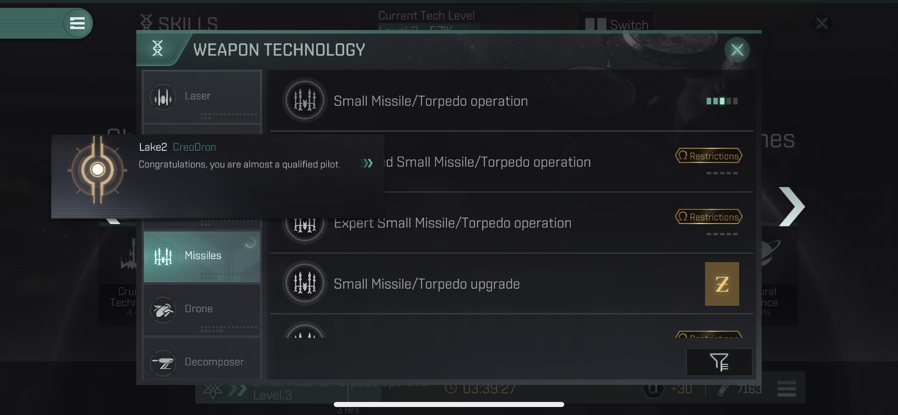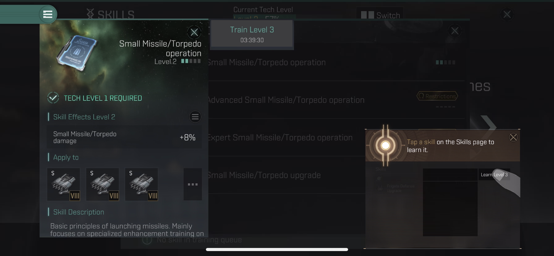 처음에는 사거리가 길고 데미지를 골고루 넣을수 있는 Small Missile/Torpedo operation의 스킬을 Level 2에서 Level 3으로 올려줍니다.