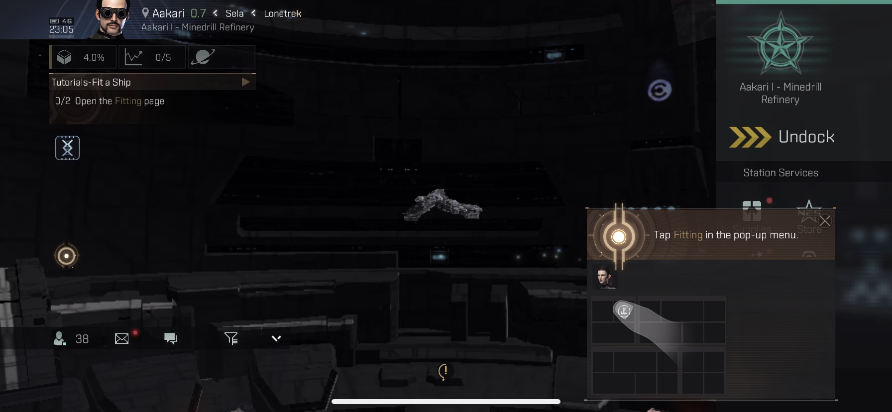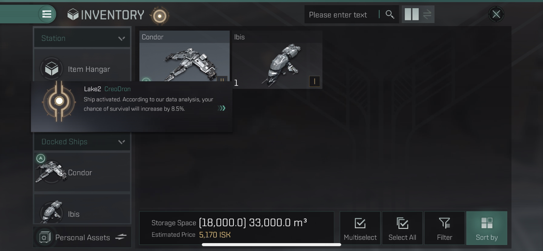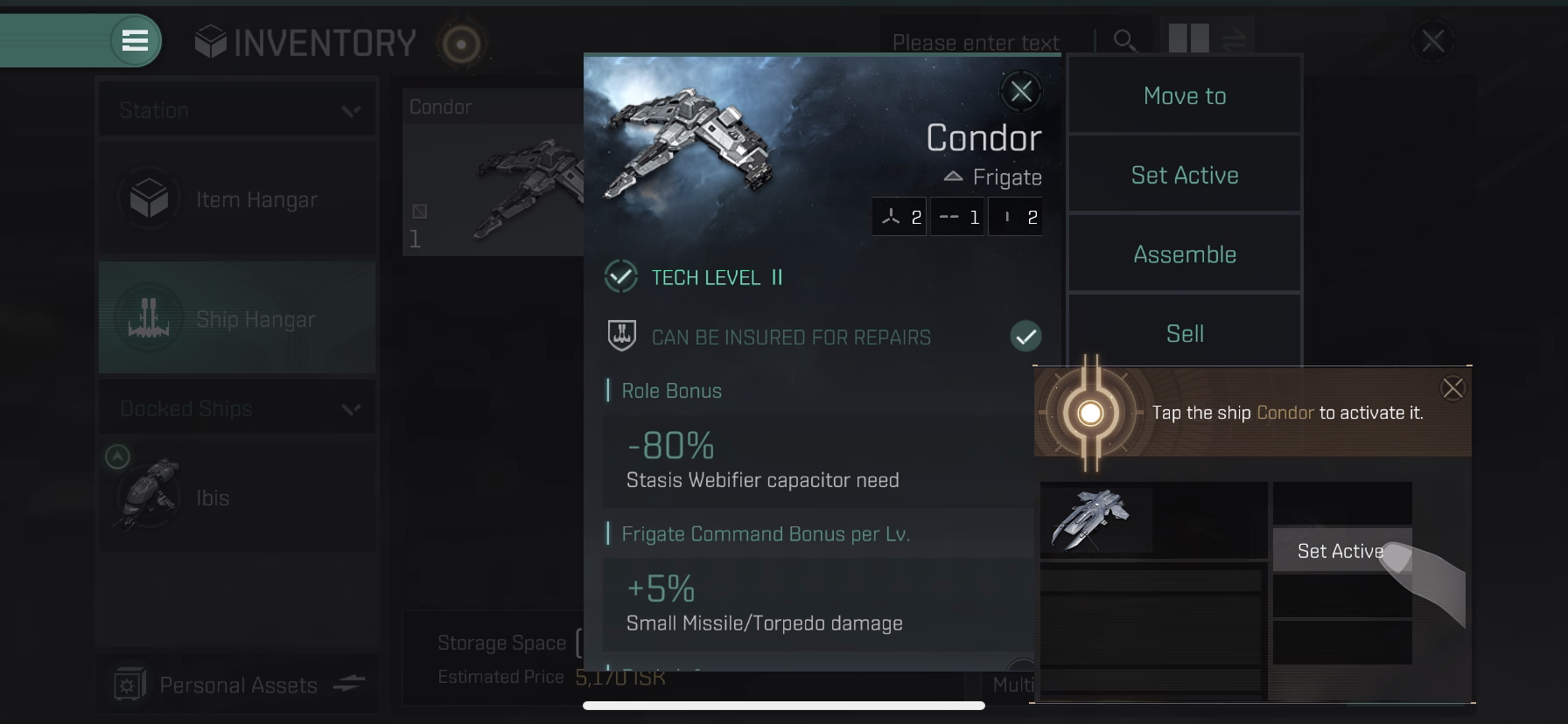 Ship Hangar > Condor 선택 > Set Active 버튼으로 함선 활성화