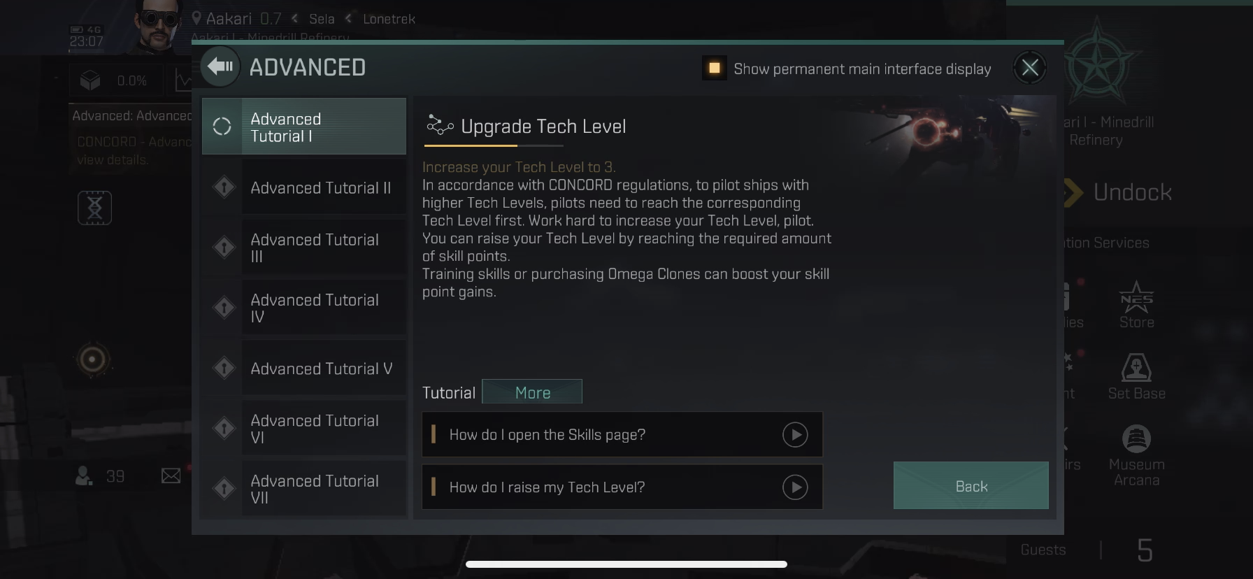 스킬창의 상단의 Current Tech Level 바를 클릭해보면 Tech 정보가 나옵니다.