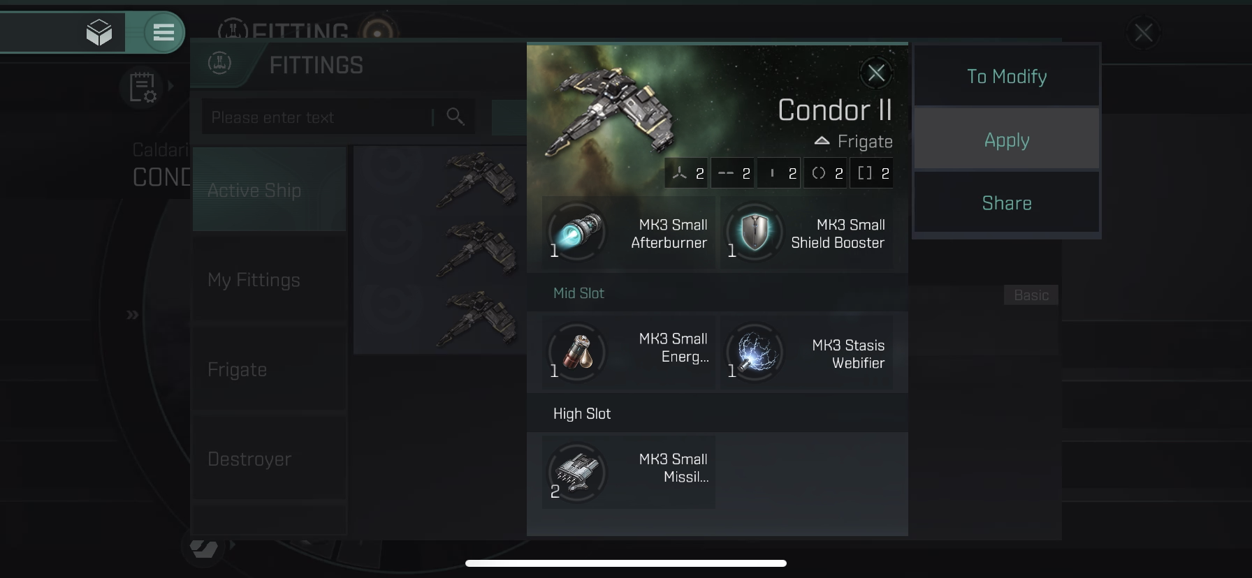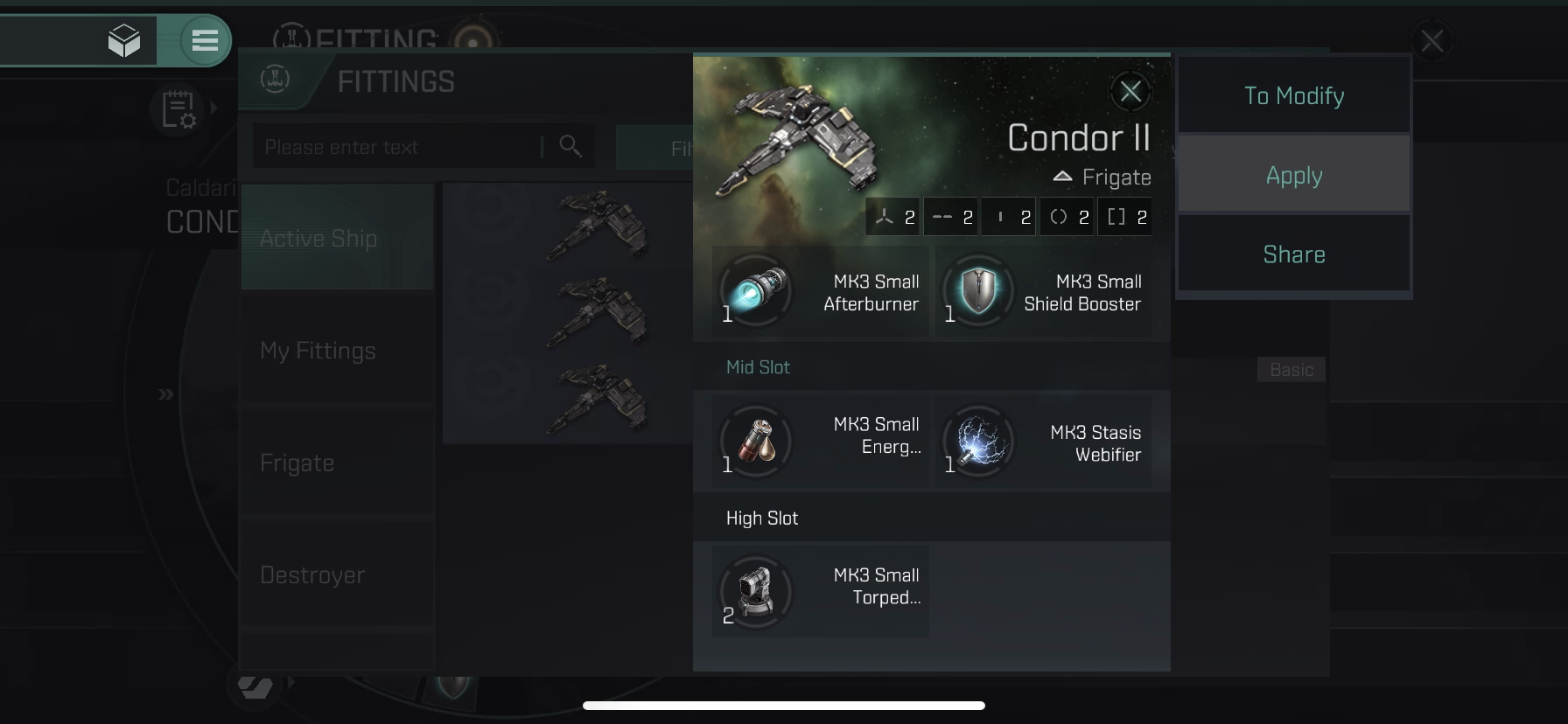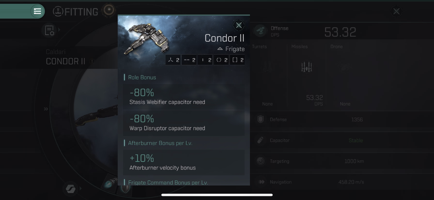 Condor II는 태클용 함선으로 Stasis Webifier(적함선의 속도를 느리게 하는 모듈), Warp Disruptor(워프를 못하게 막는 모듈) 모듈에 대한 장점이 있습니다.