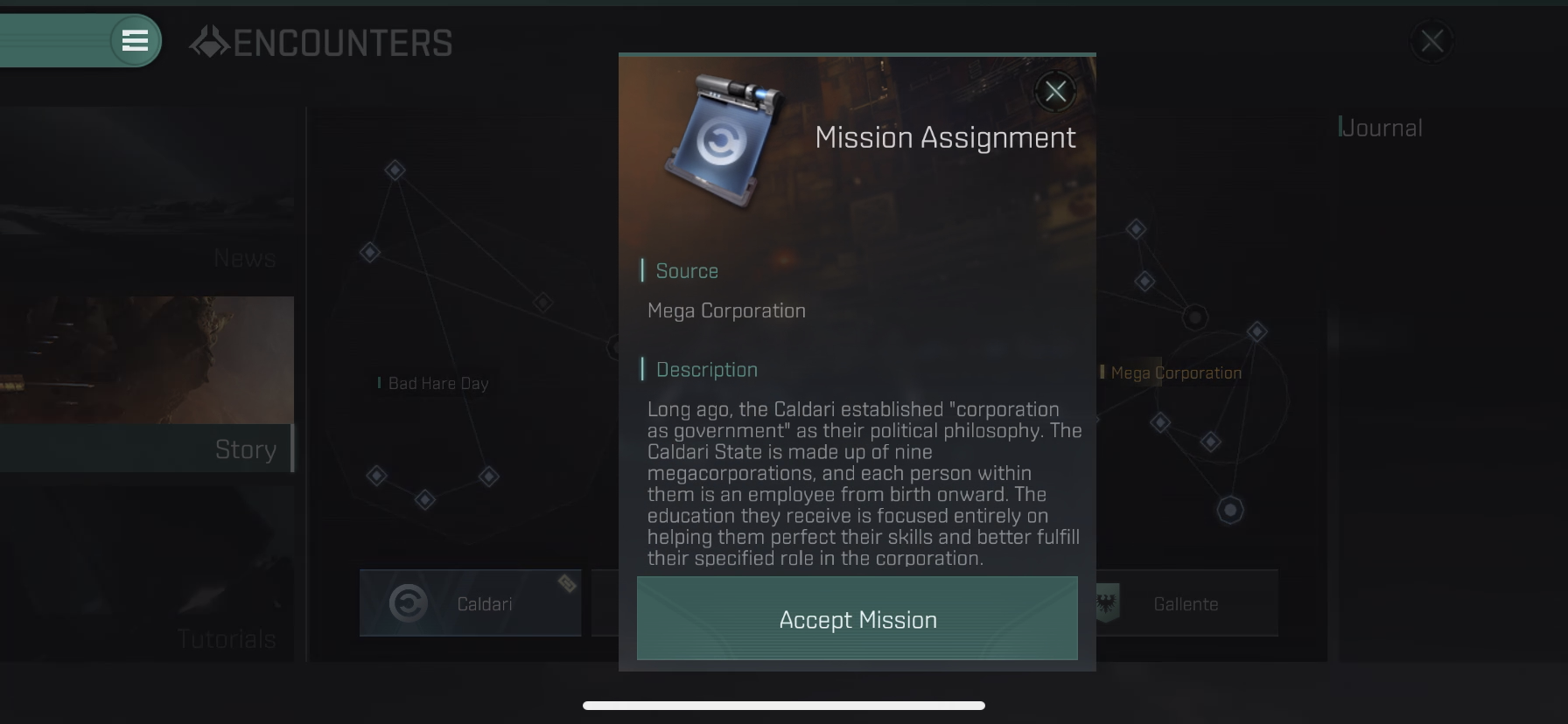 미션지를 받기 위해선 노란색으로 빤짝거리는 미션 이름(Mega Corporation)을 클릭해줍니다.