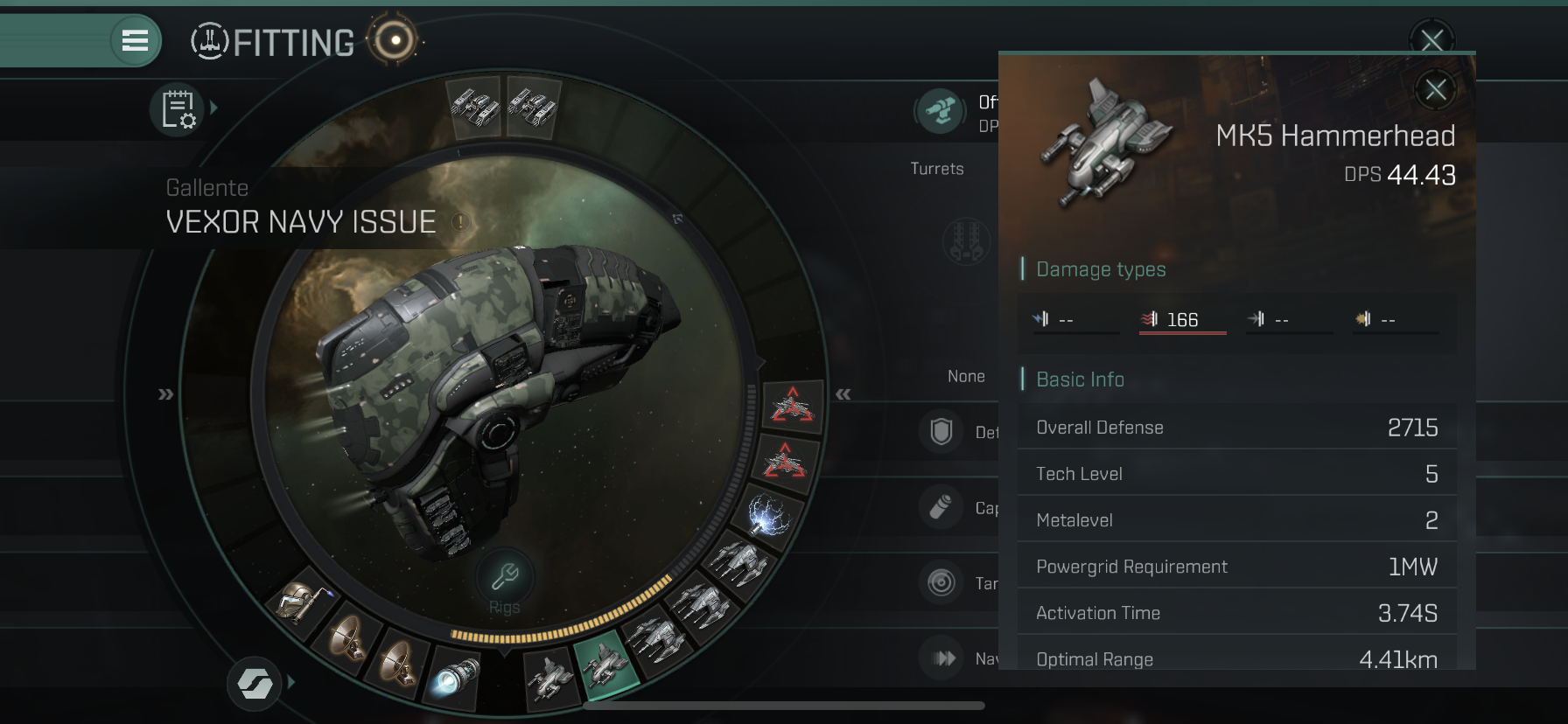 나머지 Mid Slot에는 MK5 Hammerhead 2개와 MK5 Vespa 3개를 장착하였습니다.
