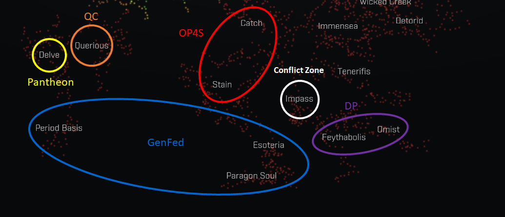 Corps and Alliances against PIBC in Delve United each other. With HappyBees, The Cosmos, The Collective, Pandemonium, Shadow Syndicate, Rekium, finally Pantheon Coalition was made.