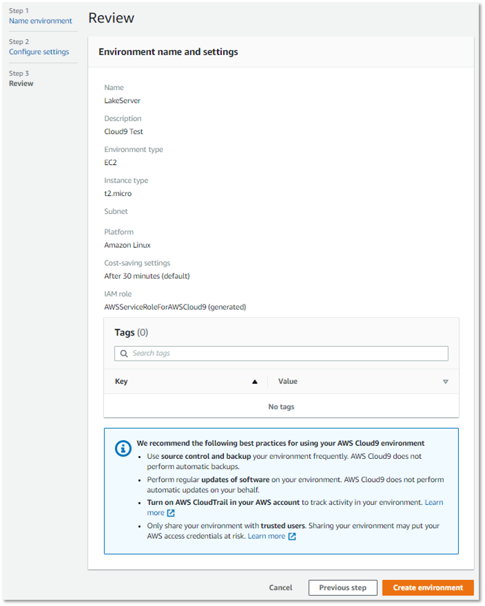 지금까지 세팅한 정보를 확인한 후에 Create environment 버튼을 클릭하여 설치를 마무리합니다.